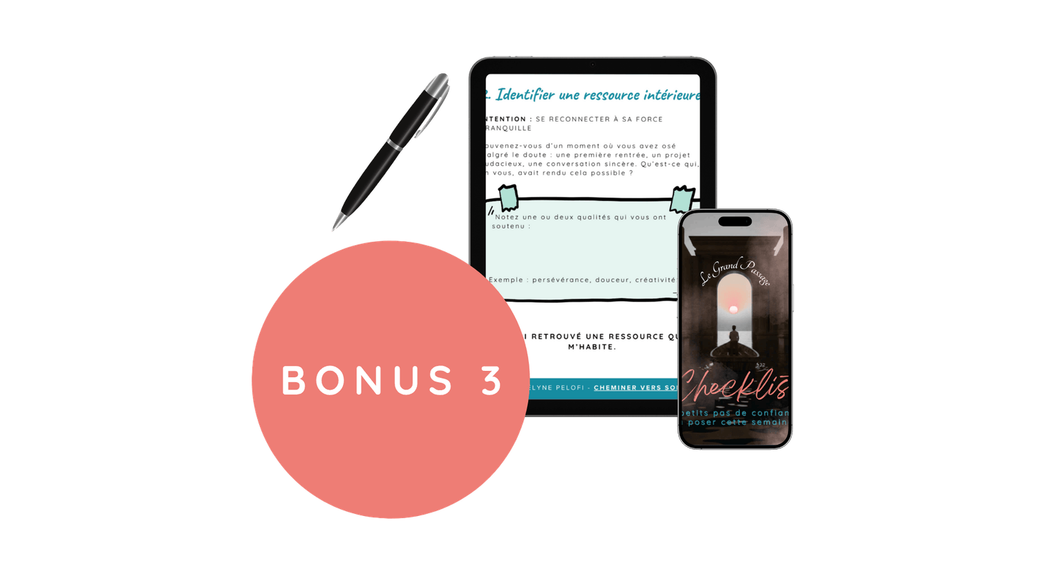 Dans cette Ă©tape, grĂące Ă un template dâauto-coaching clair et simple, vous allez enfin remettre la main sur ce qui fait votre valeur rĂ©elle : votre crĂ©ativitĂ©, votre patience, votre sens du lien, votre capacitĂ© Ă rebondir⊠toutes ces forces que la fatigue a mises en sourdine.